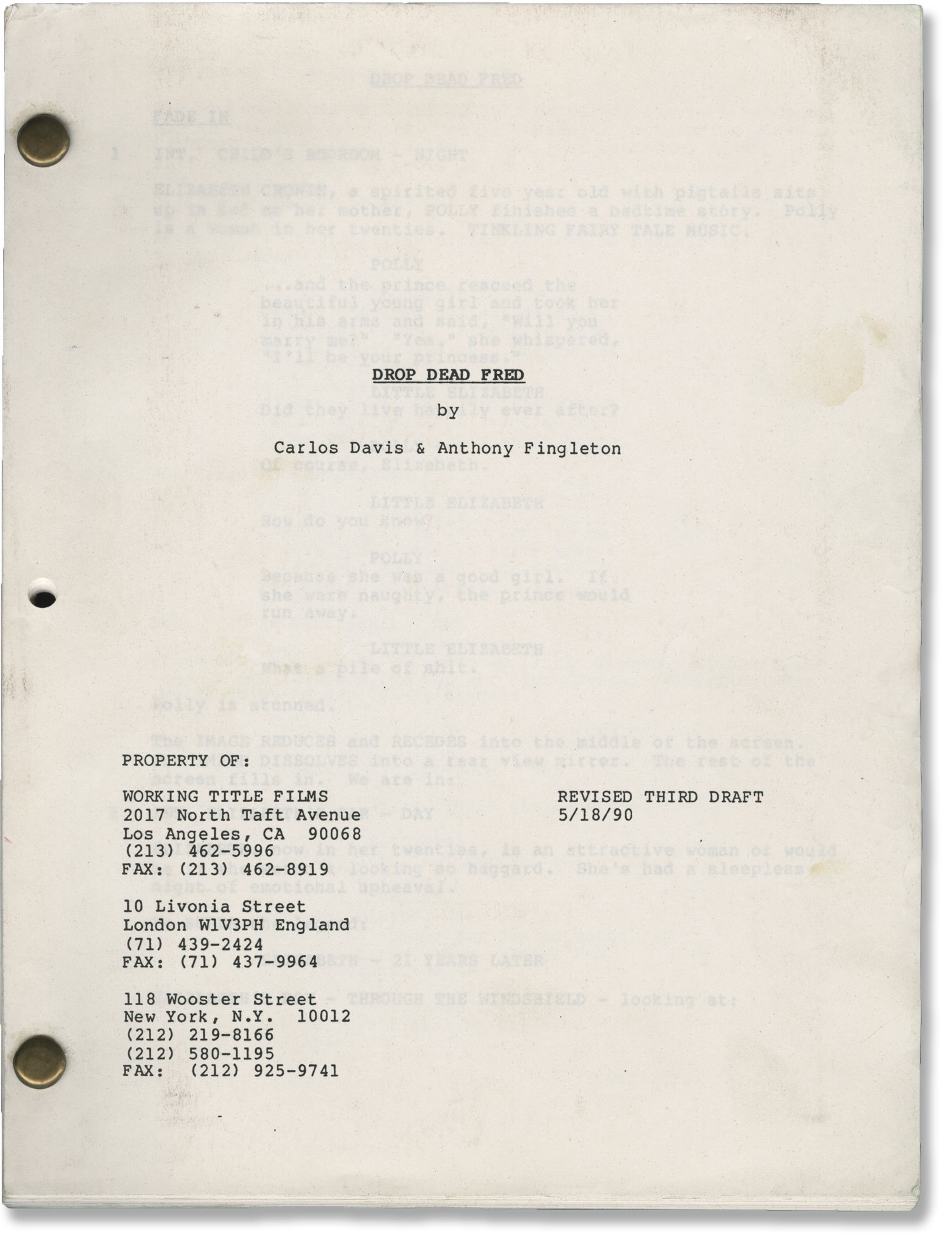 Drop Dead Fred Original Screenplay For The 1991 Film By Jong Ate De Director Carlos Davis Anthony Fingleton Screenwriters Phoebe Cates Rik Mayall Starring 1990